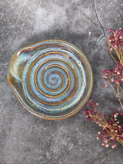 Coastal Swirl Spoon Rest – Handmade Stoneware in Blue & Amber Glaze
