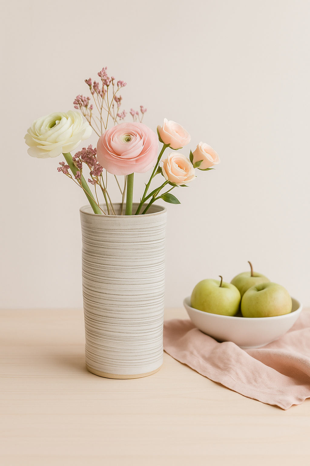 Hand-thrown from white stoneware clay, this vase celebrates balance — between modern lines and handmade charm, between color and calm. The satin glaze gives it a gentle sheen that catches light beautifully, making it just as lovely on its own as with a few fresh or dried blooms.