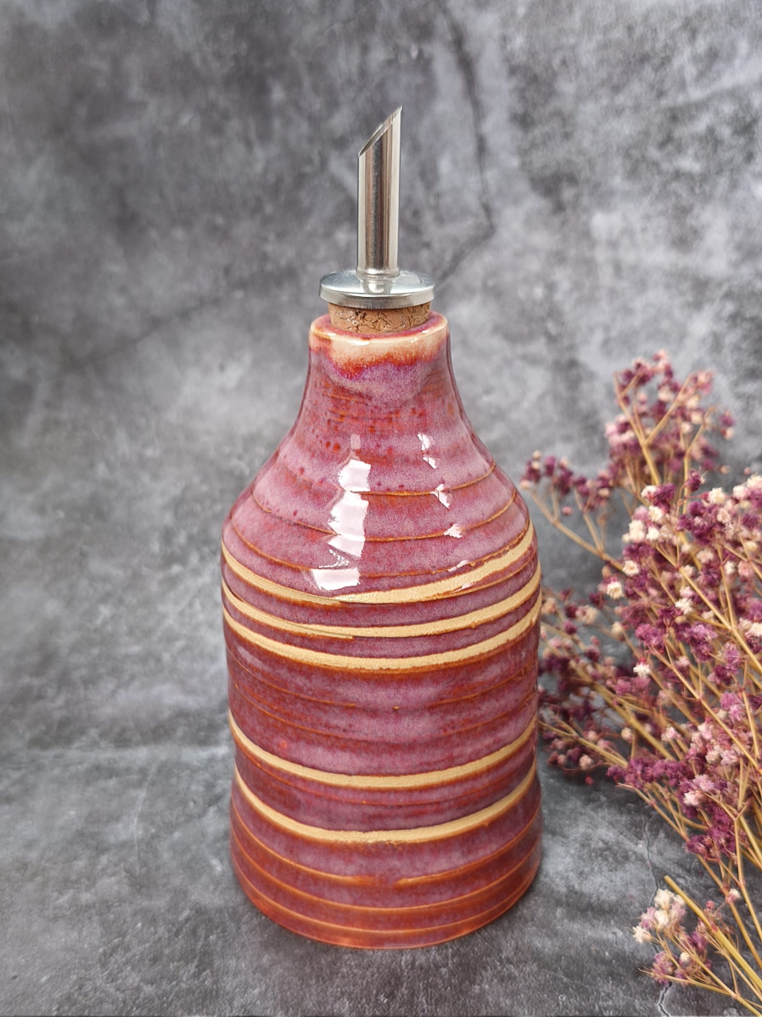 Crafted from high-quality stoneware, this bottle features hand-thrown grooves and a glossy glaze that blends rich coral, rose, and amber tones. The stainless steel spout with a natural cork stopper ensures easy and precise pouring, making it perfect for olive oil, vinegar, or homemade dressings.