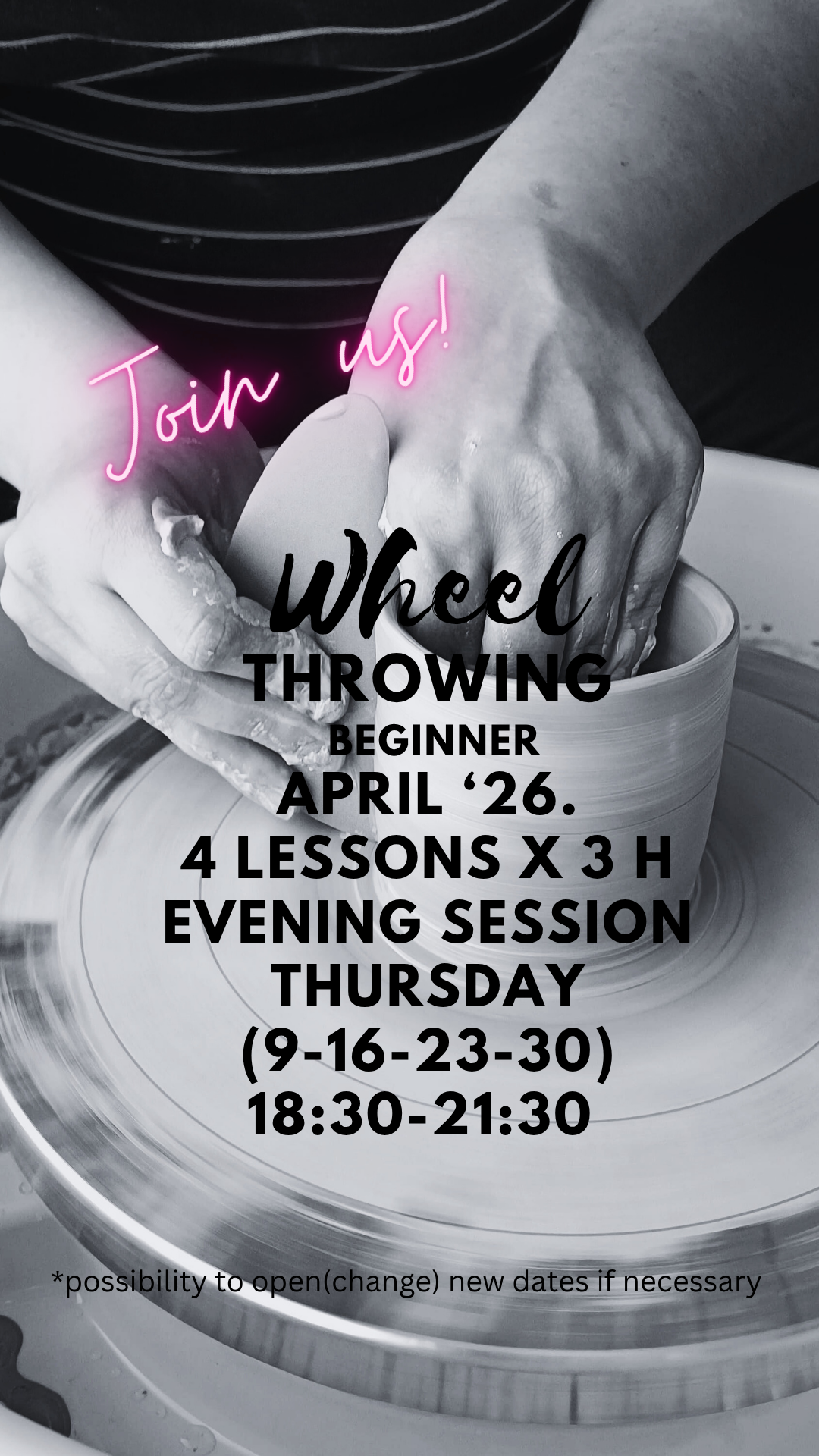 Wheel throwing beginners April’26. Thursdays 18:30-21:30
